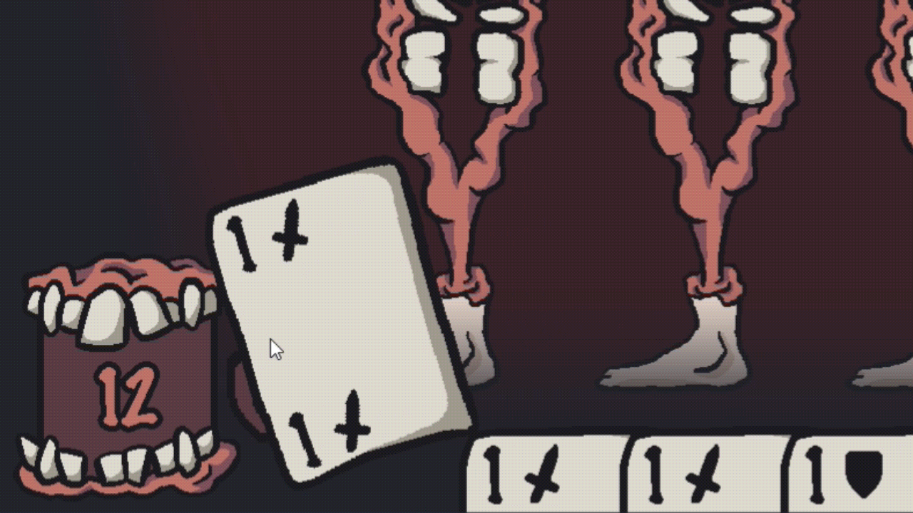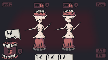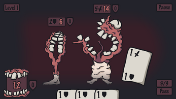 Controls : Mouse controls to drag cards. Drag your cards to your enemies to activate them, or to your mouth (bottom left) to consume the card. Click the 'Pass' button to end your turn.